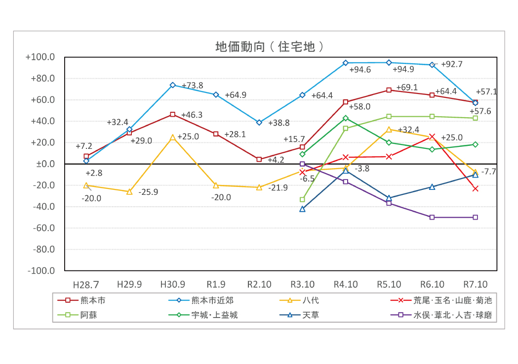 令和7年の不動産に関する景気動向指数(DI)は、昨年度までTSMC関連の投資・開発の影響により、熊本市近郊(特に菊陽町、合志市、大津町)において上限値に近い高水準で推移していたが、今年度はその過熱感に一服の兆しが見られ、指数にも落ち着きが見られる。加えて、こうした動向は熊本市及び北部地域(荒尾・玉名・山鹿・菊池)にも波及しており、各種項目において同様に過熱感の緩和が確認された。